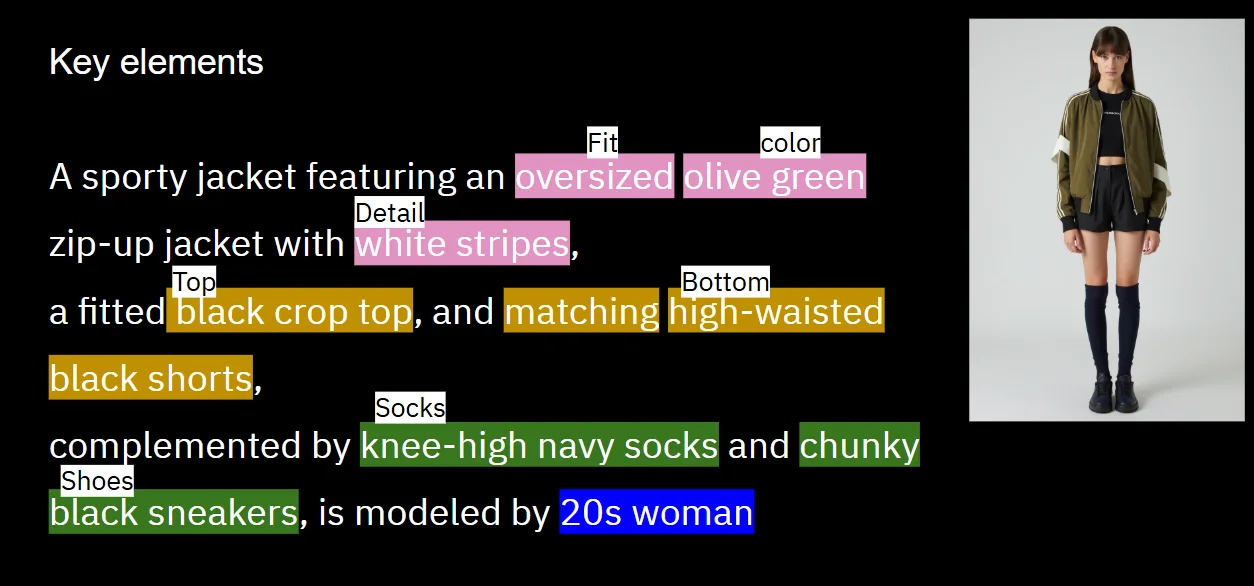 Prompt: “A sporty ensemble featuring an oversized olive green bomber jacket with white stripes, a fitted black crop top, and high-waisted black shorts. Paired with knee-high navy socks and dark sneakers, this look embodies a casual, athletic aesthetic, is modeled by 20s woman”