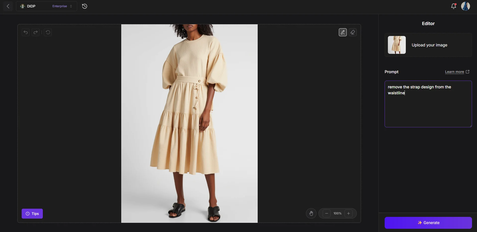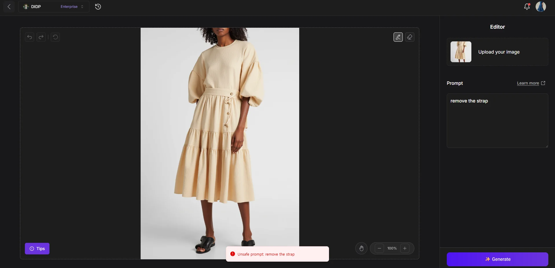 When using prompts like "remove the strap", your request might be blocked by the system’s safety check—even if you're simply editing a fashion design element.